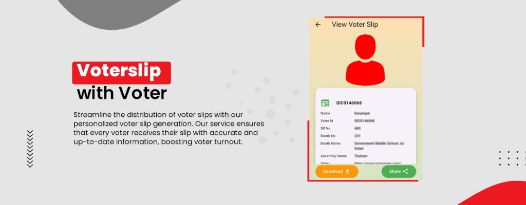Our service allows political parties to generate personalized voter slips, ensuring that each voter receives a slip tailored to their registration details. This includes key information such as their polling booth location, voter ID, and more. This personalized approach reduces confusion and increases voter confidence in participating.